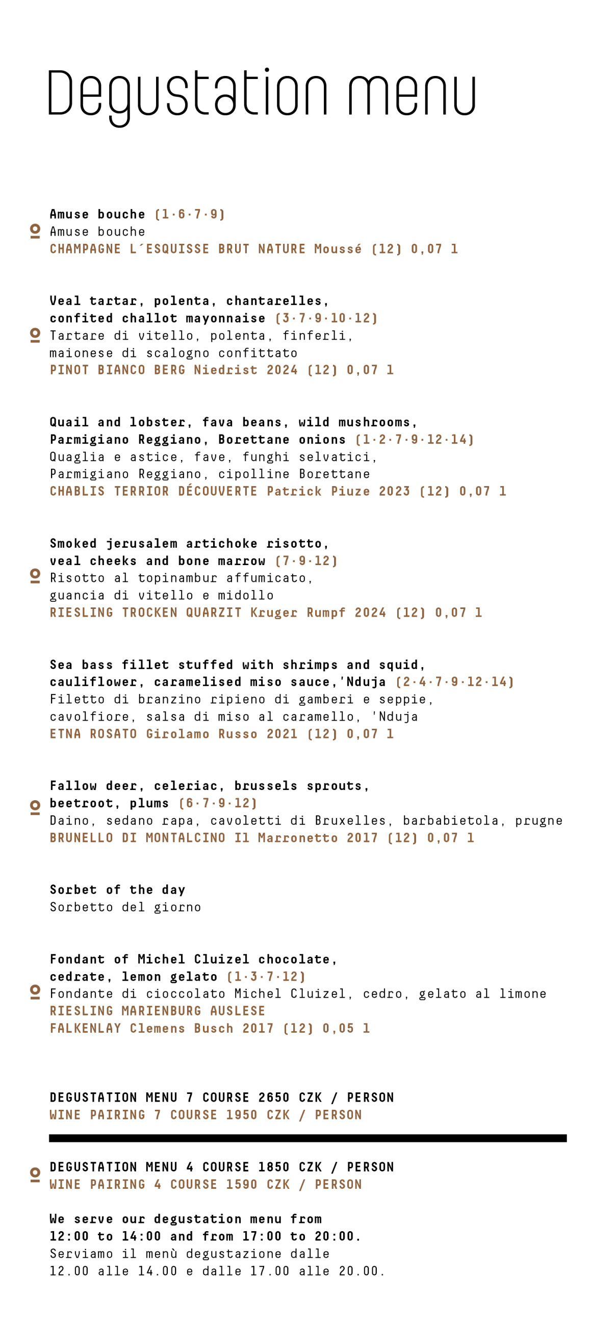 Service charge of 12,5 % will be added to the final bill for the groups of 8 and more guests. All prices are in Czech crowns and inluding VAT.