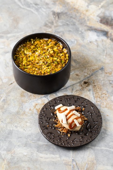 Panna cotta al pistacchio, Amarene, spuma di vaniglia grigliata