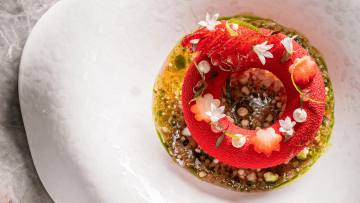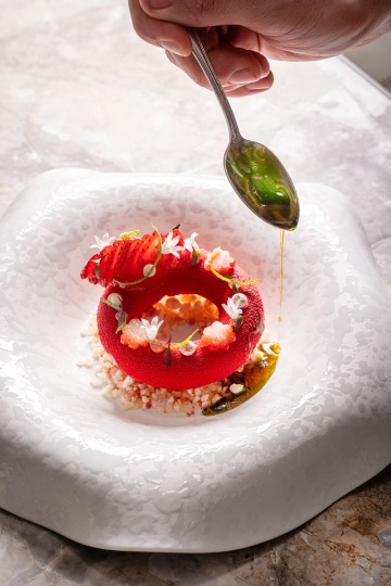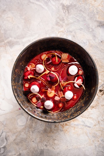 Mousse di fragole e cioccolato bianco, consommé di fragole