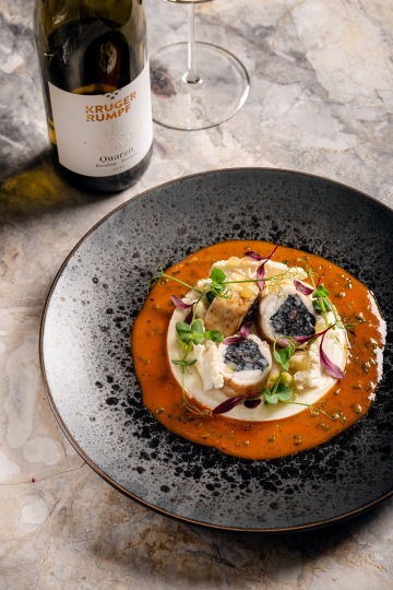 Cauliflower cream soup, black truffle, veal cheeks