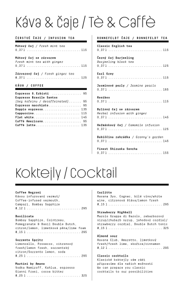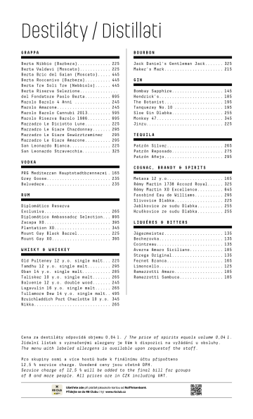 u obsluhy. Pro skupiny osmi a více osob bude k finálnímu účtu připočítáno 12,5% service charge. Uvedené ceny jsou v Kč včetně DPH